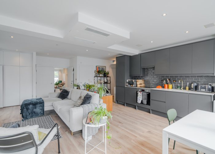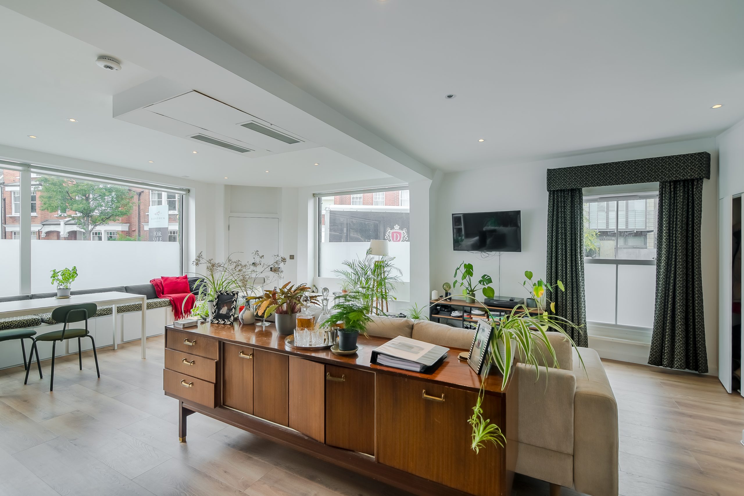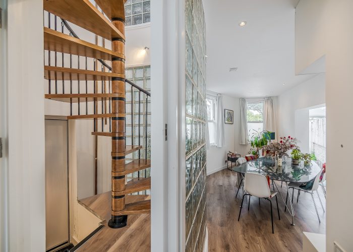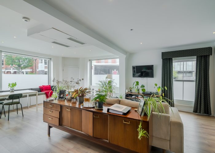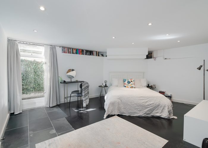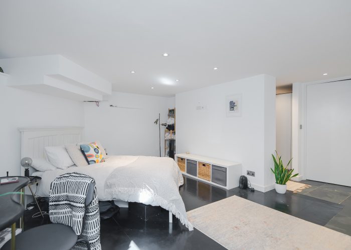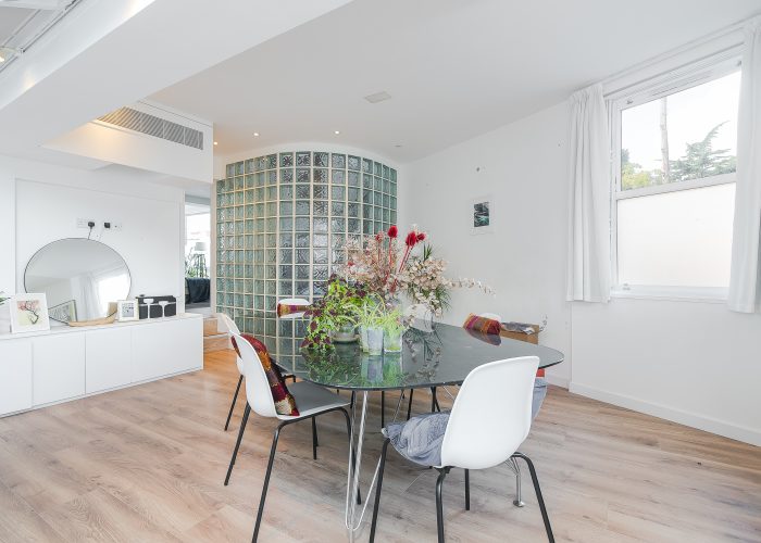 The flexible accommodation comprises a large 25’1 x 23’4 open plan reception room, and a dining room which gives access to the garden and could alternatively be used as a third bedroom. There is a master bedroom with separate walk in wardrobes and en suite shower room and a second bedroom with shower/wc. The property was once the creative studio for Jim Henson (the creators of The Muppets) and has since been thoughtfully modernised to include an air-source heat pump for both heating and air-conditioning, maximising light, built in Bose speakers and will include curtains and blinds as fitted.
