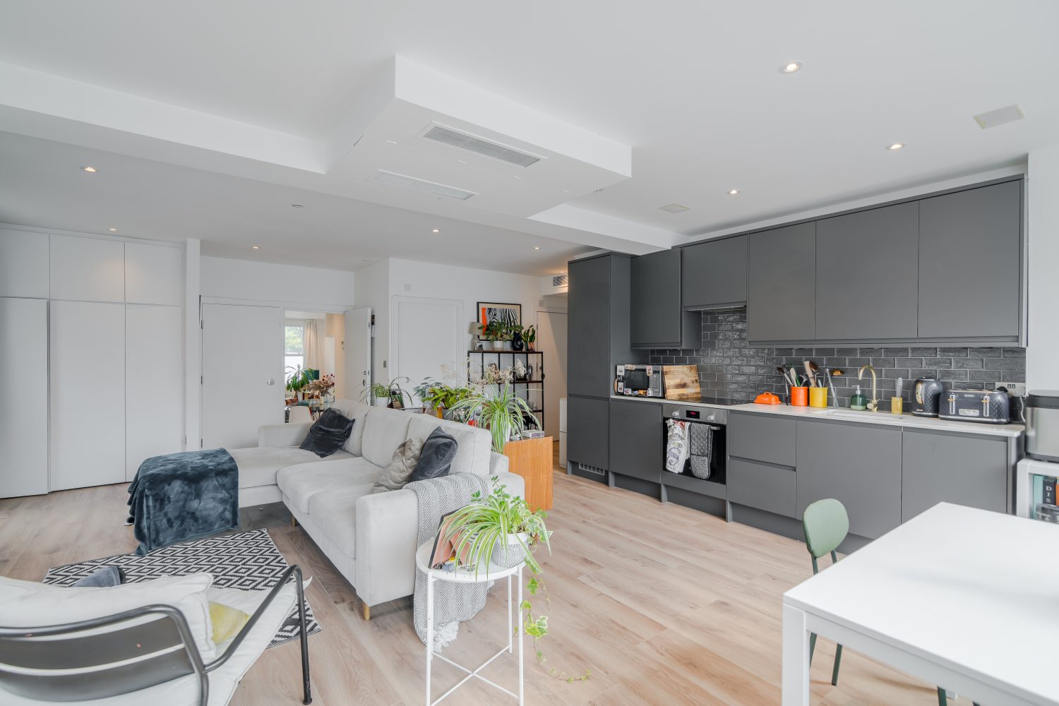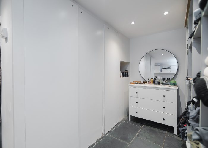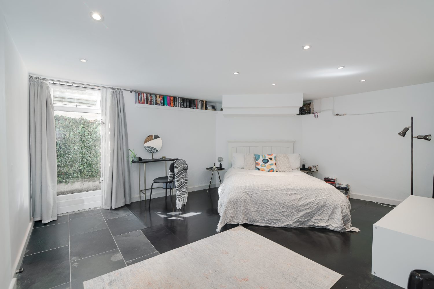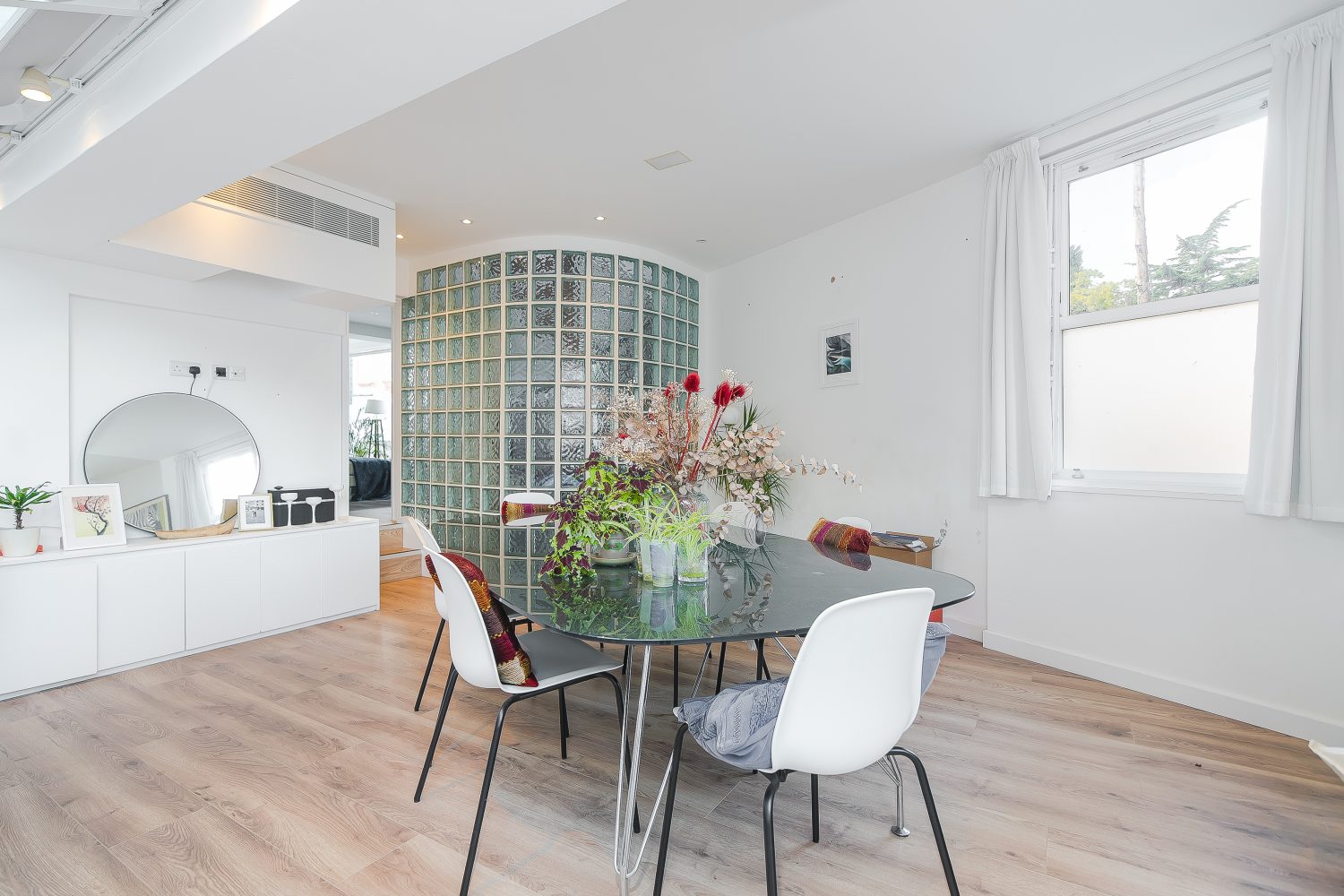 The flexible accommodation comprises a large 25’1 x 23’4 open plan reception room, and a dining room which gives access to the garden and could alternatively be used as a third bedroom. There is a master bedroom with separate walk in wardrobes and en suite shower room and a second bedroom with shower/wc. The property was once the creative studio for Jim Henson (the creators of The Muppets) and has since been thoughtfully modernised to include an air-source heat pump for both heating and air-conditioning, maximising light, built in Bose speakers and will include curtains and blinds as fitted.