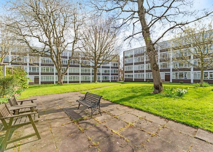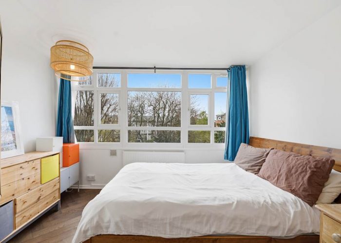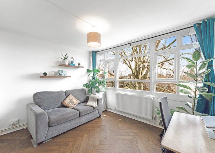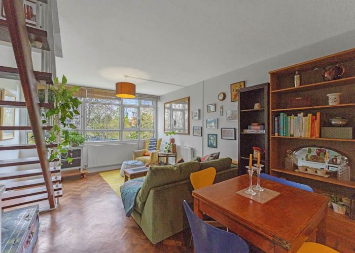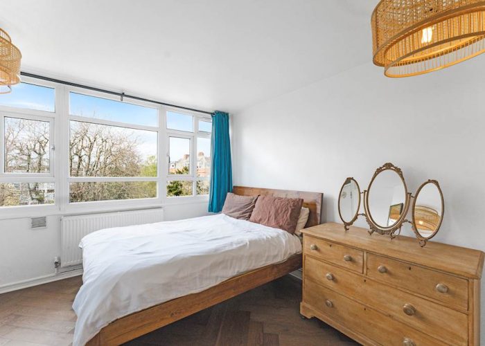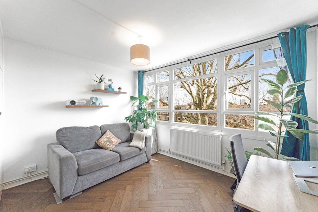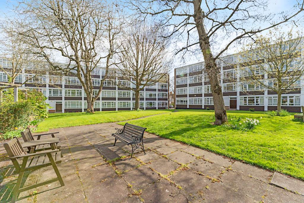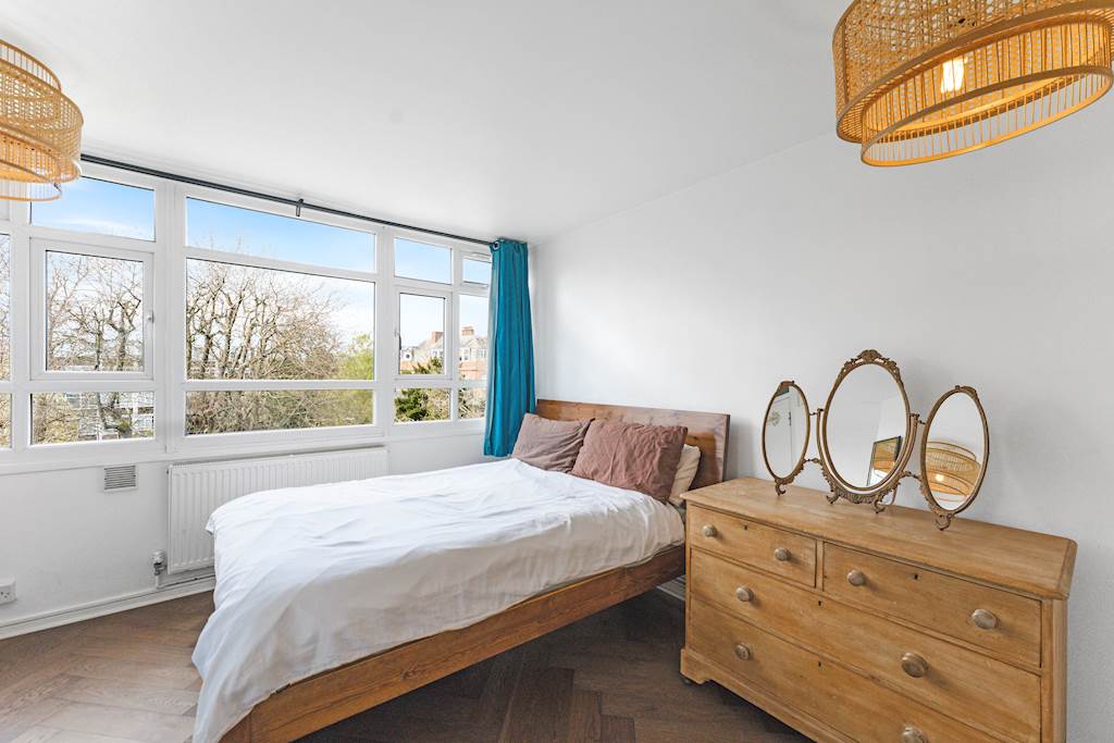 Refurbished to a good standard with wooden floors throughout, the flat has a spacious reception and dining space overlooking leafy communal gardens. The flat offers a quiet and bright living space. A fitted kitchen, open to the dining area, has lots of storage and worktop space. The top floor has two double bedrooms with built-in storage and a modern bathroom. Large, relatively newly installed double-glazed windows offer leafy views from each room. The flat has residents’ parking and access to communal gardens.