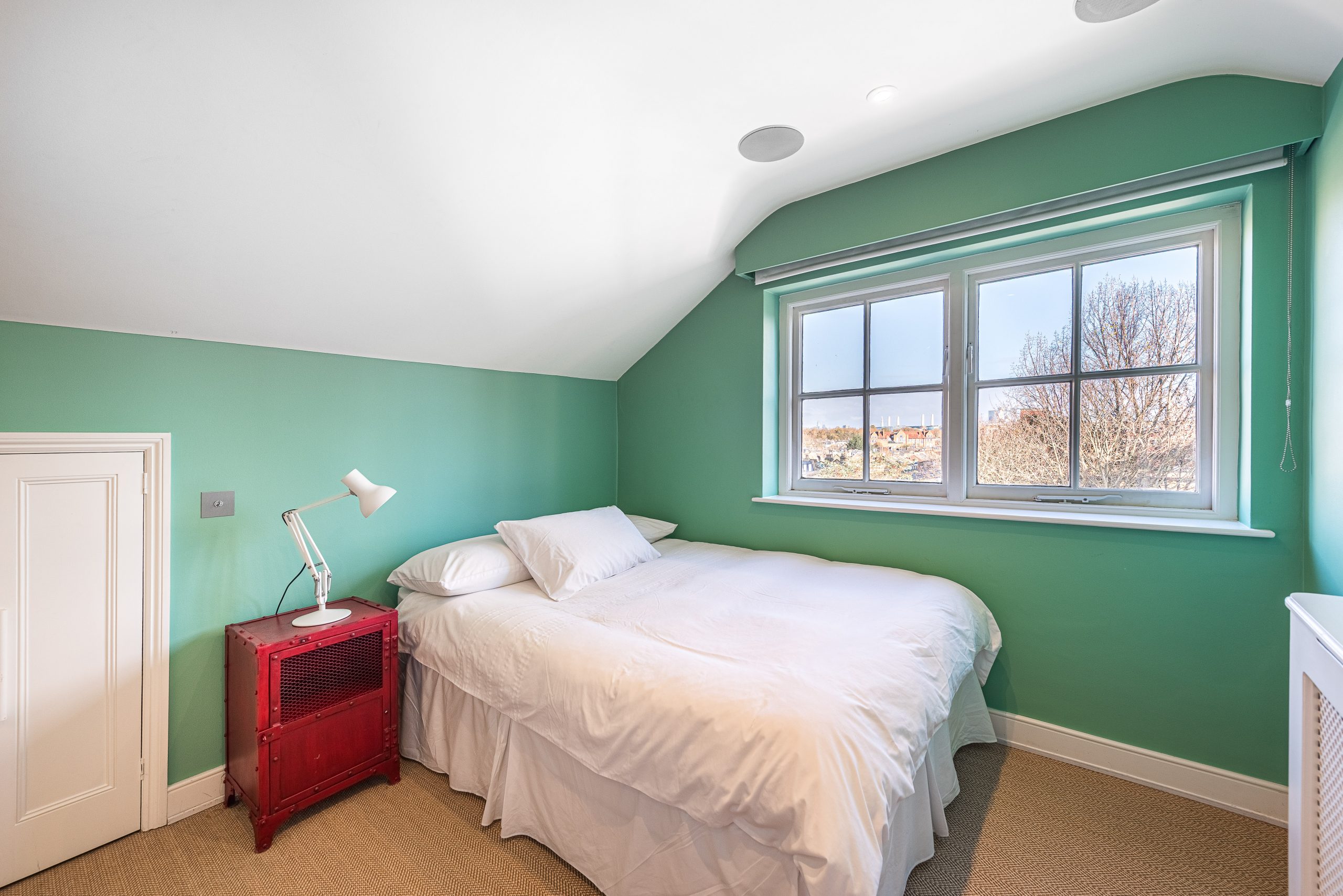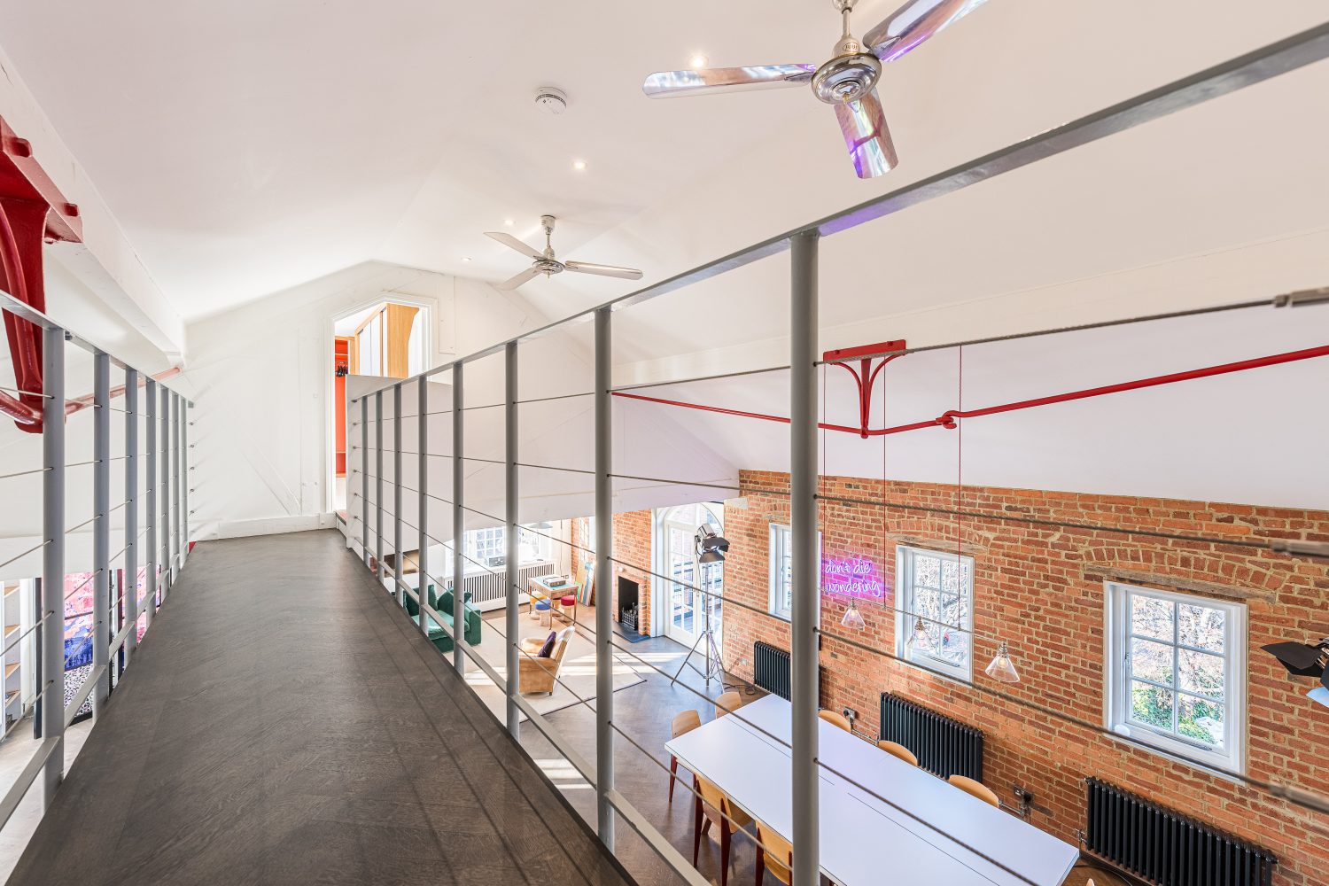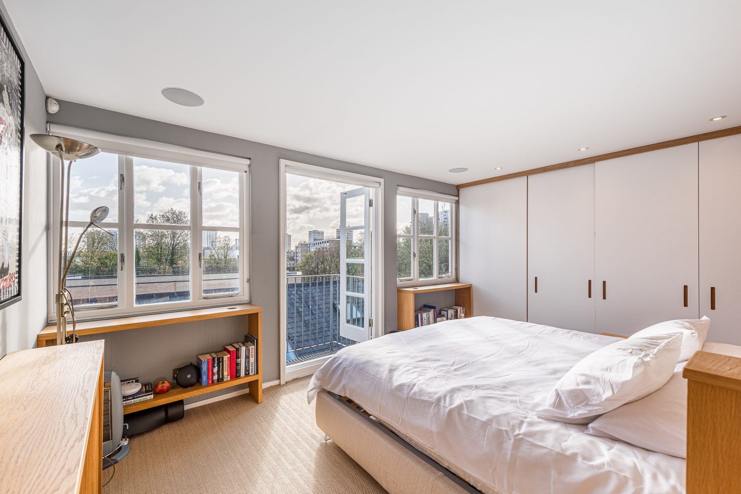 Naturally bright throughout, on the second floor there is a huge open plan kitchen/reception/ dining room with bespoke wooden floors, exposed brick and double doors leading out onto two private balconies. There is also a conservatory spanning the width of the reception which is currently being used as a study. The modern integrated kitchen has industrial style units, built in appliances, a pantry and breakfast island. There is also a utility room and guest WC.