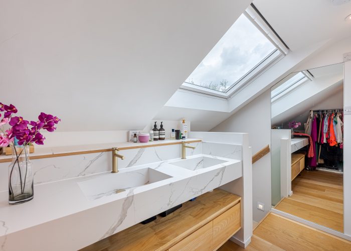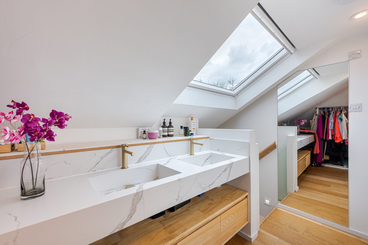 The house has been architecturally designed to give the house wonderful entertaining space and well-proportioned bedrooms. To the rear of the ground floor there is a bespoke kitchen that leads to a dining area and reception room, all of which provide access to the private south-west facing garden. To the front there is a second reception room, which could be used as a fourth bedroom, a study, shower room and utility room. Upstairs there is a master bedroom to the front of the house which is connected to an en-suite bathroom and dressing room on the floor above. There are two further double bedrooms served by a large shower room. No expense has been spared in the house, with Miele appliances in the kitchen, bespoke joinery throughout, air conditioning in the kitchen and main living room and under floor heating in all bathrooms.